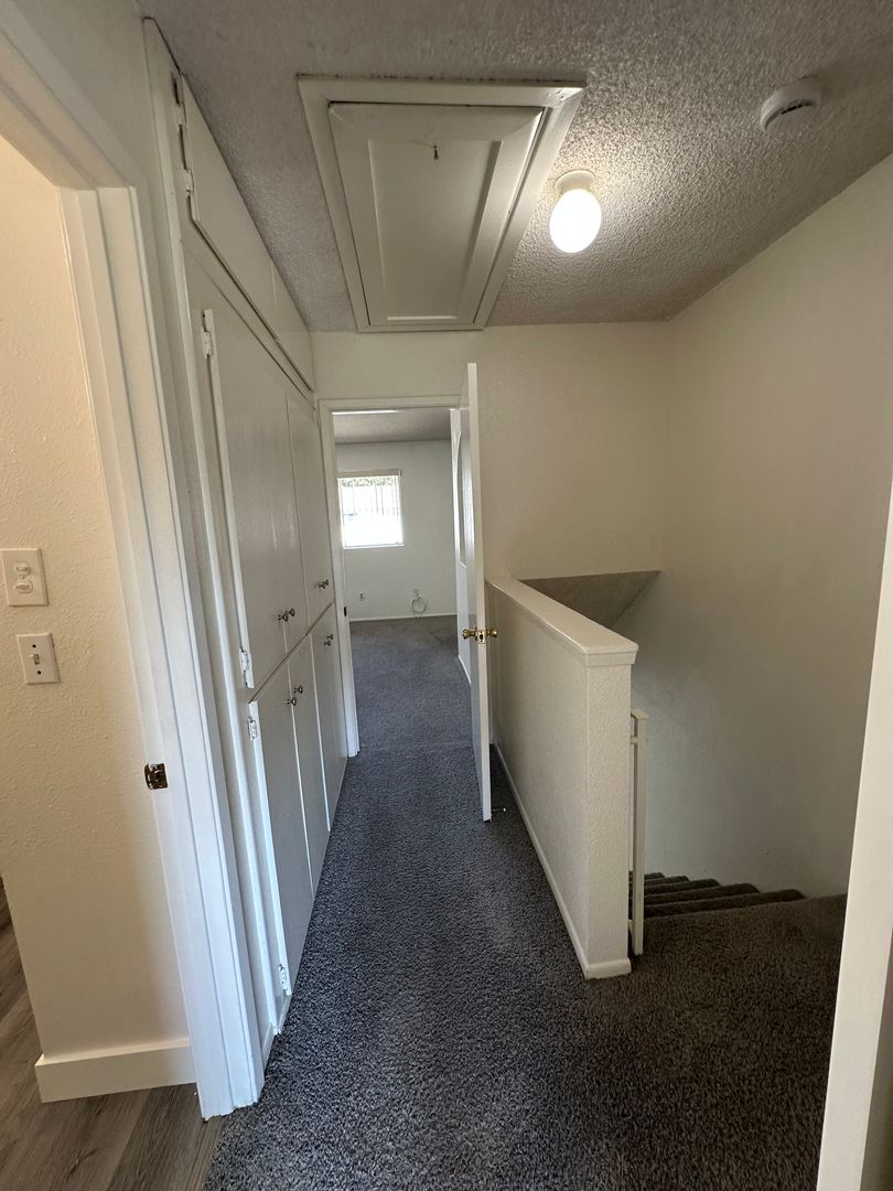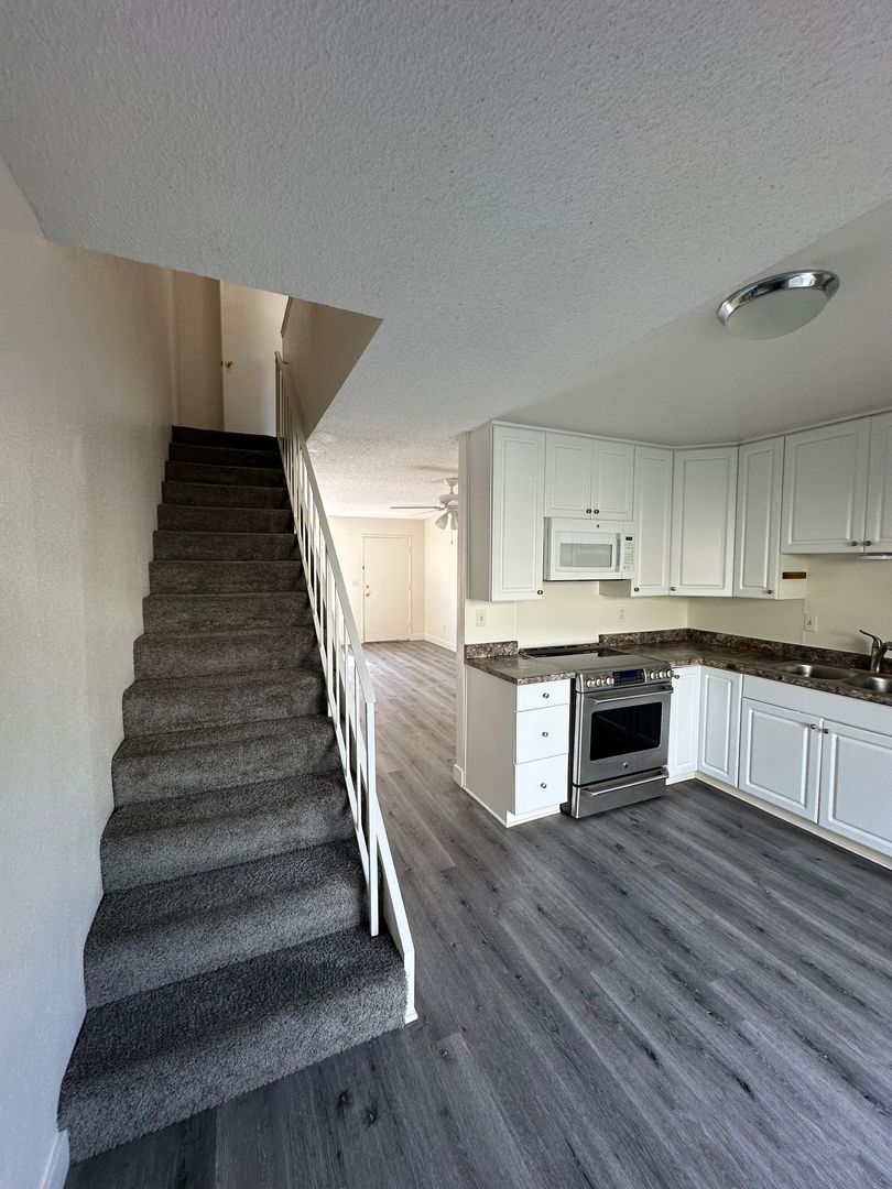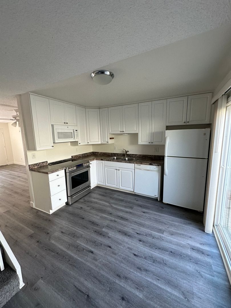 Enjoy Stylish Plank Flooring Downstairs and Plush Carpet Upstairs. The Light and Bright Kitchen Features an Electric Stove and Refrigerator, with direct access to a Private Patio off the Kitchen—perfect for Outdoor Dining or Relaxing.