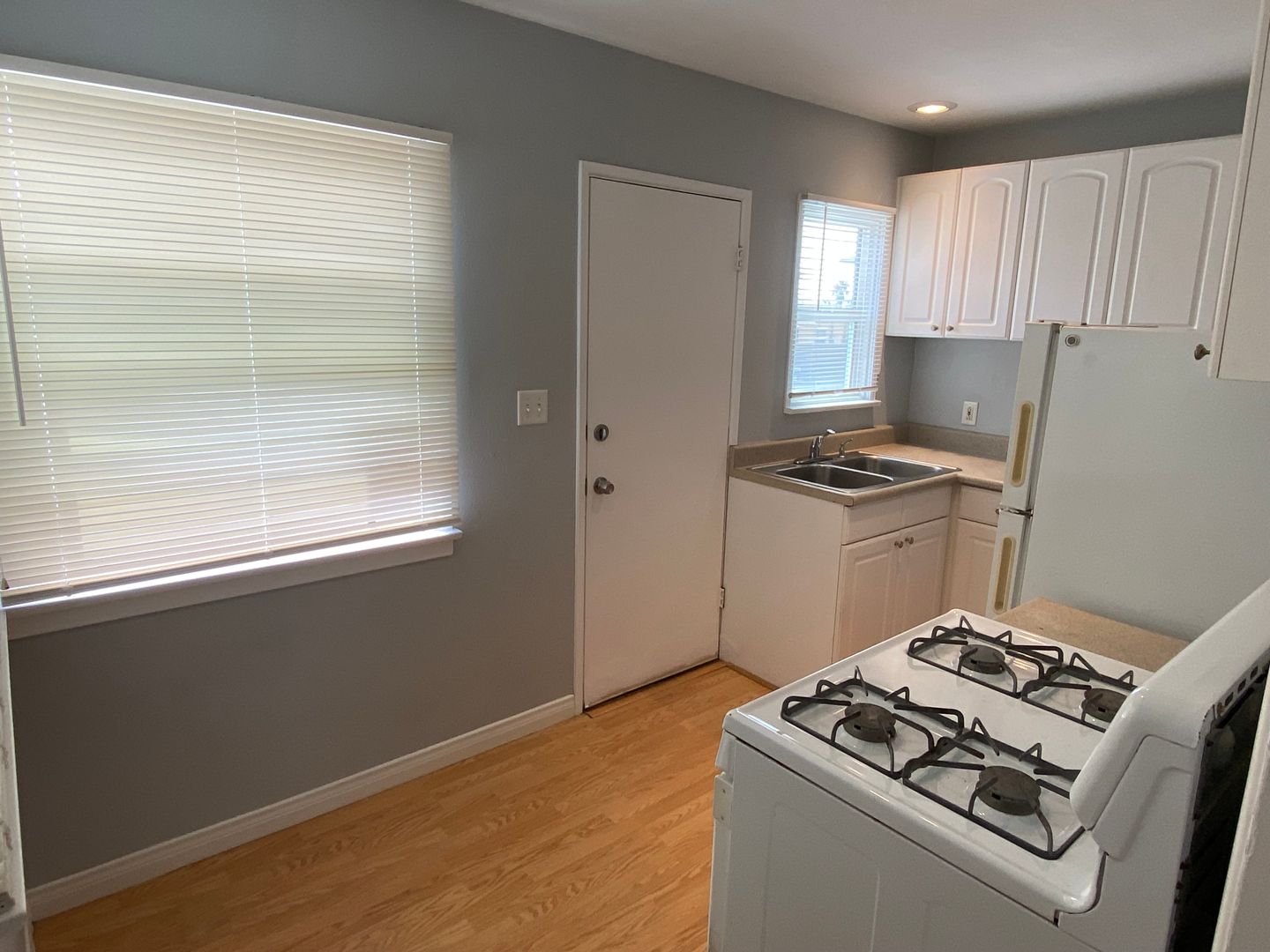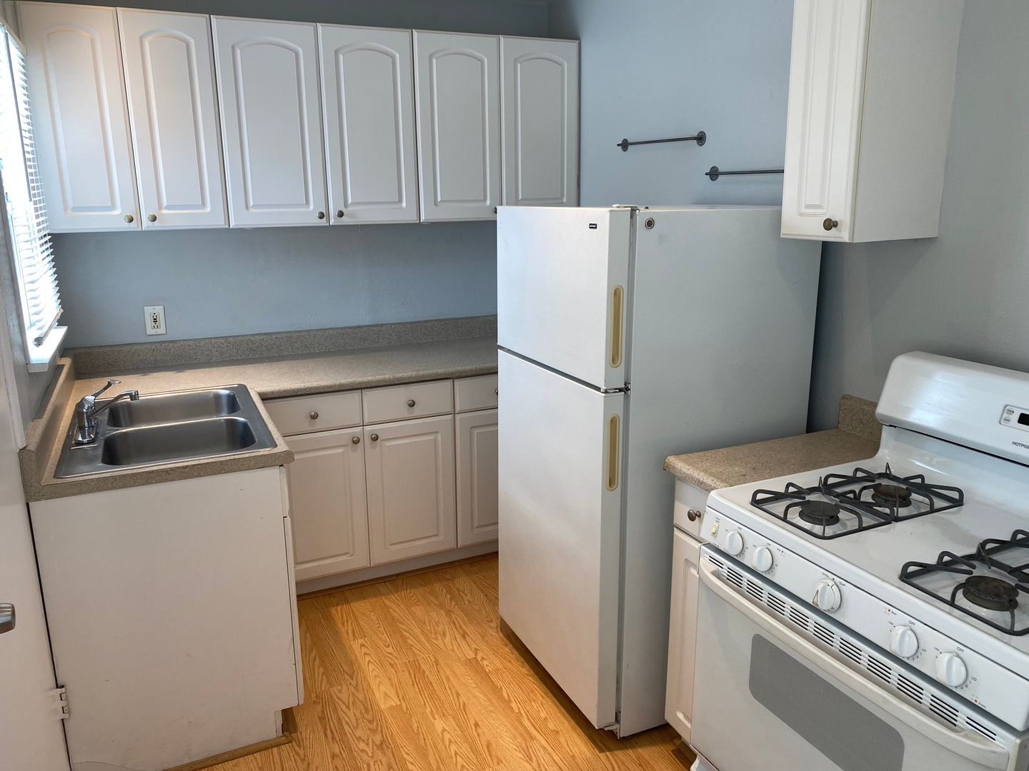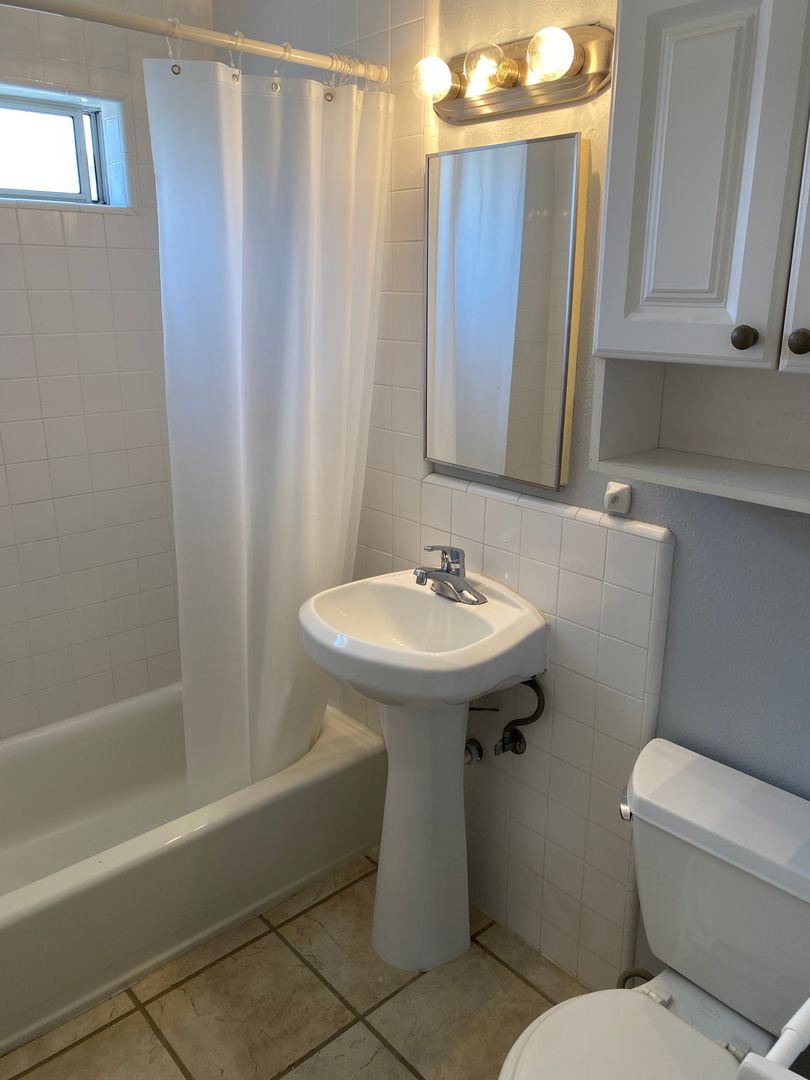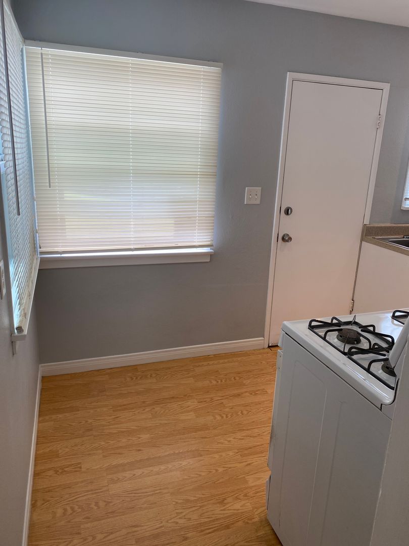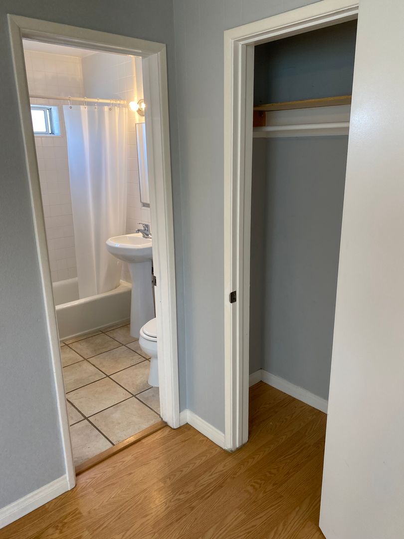This studio has laminate wood floors throughout and separate kitchen with full-size fridge and stove. Lots of storage - entire west wall of studio is closets and cabinets. Plenty of room for a full/queen bed, sofa, dresser, desk, etc.
