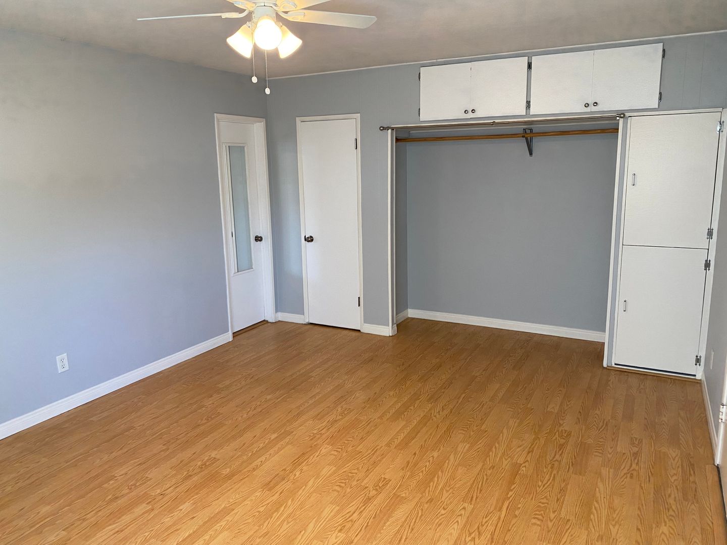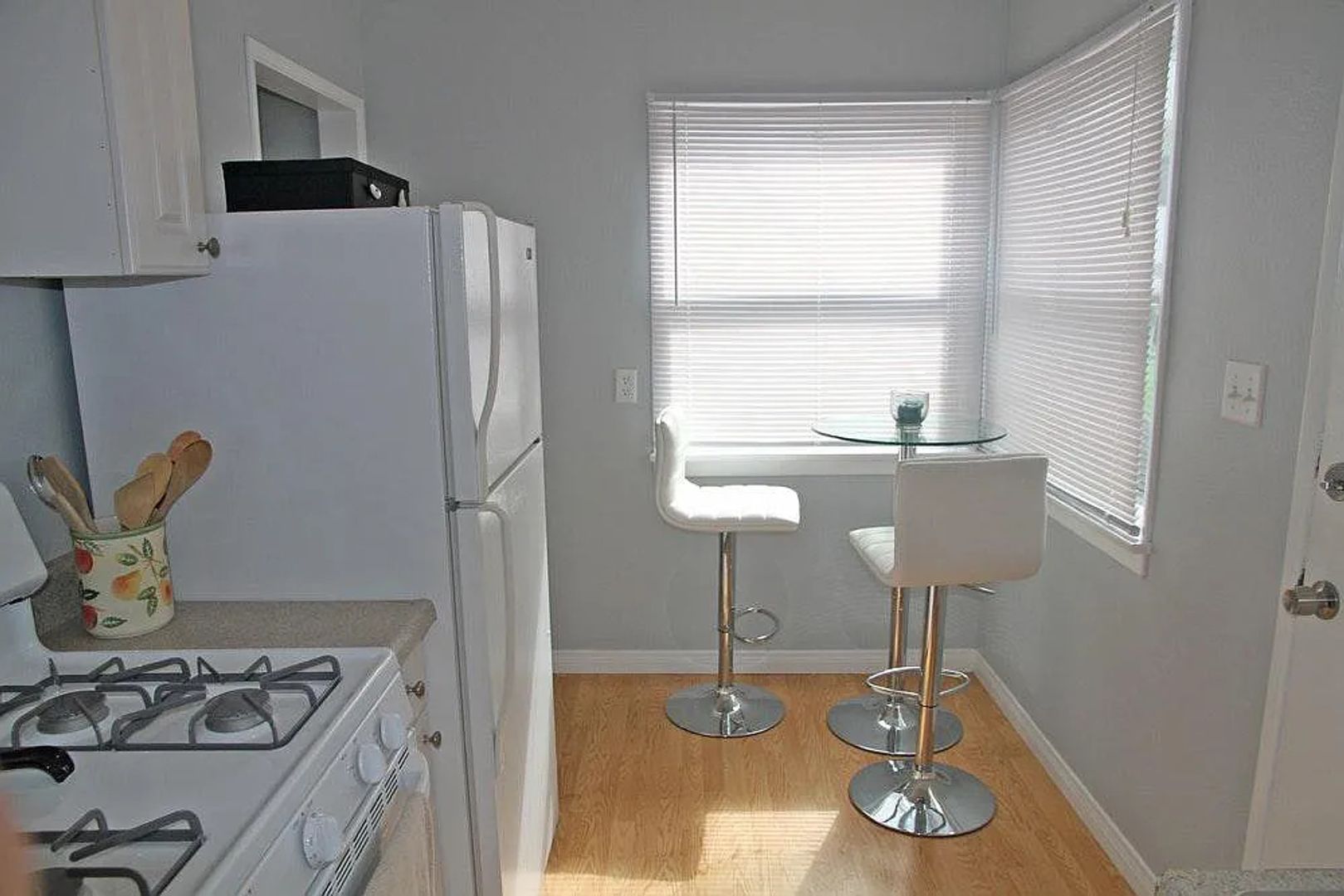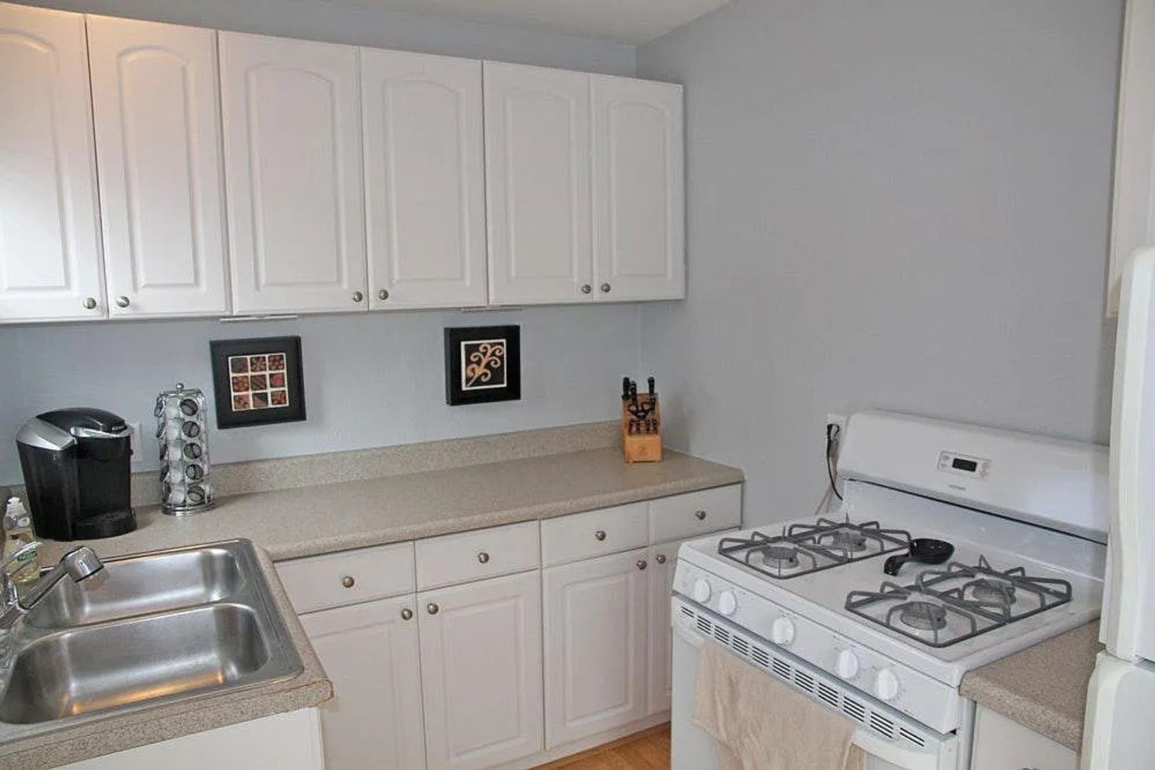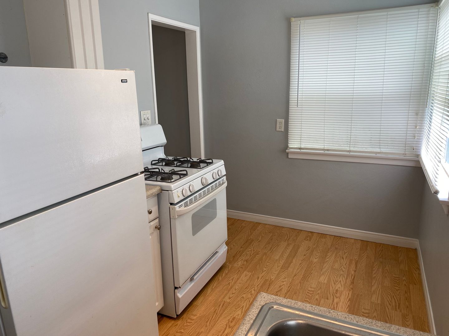 This studio has laminate wood floors throughout and separate kitchen with full-size fridge and stove. Lots of storage - entire west wall of studio is closets and cabinets. Plenty of room for a full/queen bed, sofa, dresser, desk, etc.
