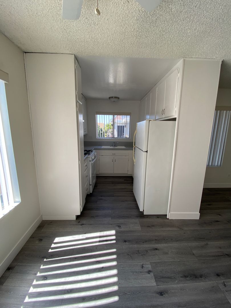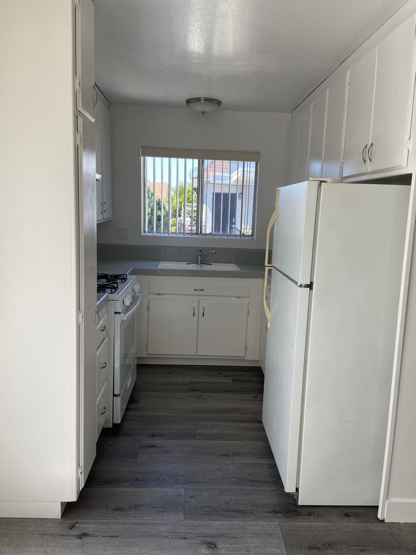 Large Upgraded One Bedroom, One Bath Upstairs Unit: Plank Flooring Throughout, Light and Bright Kitchen Area with Gas Stove and Refrigerator.