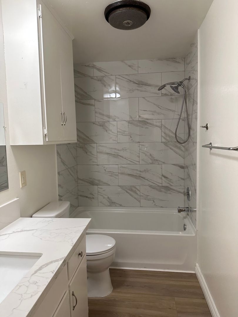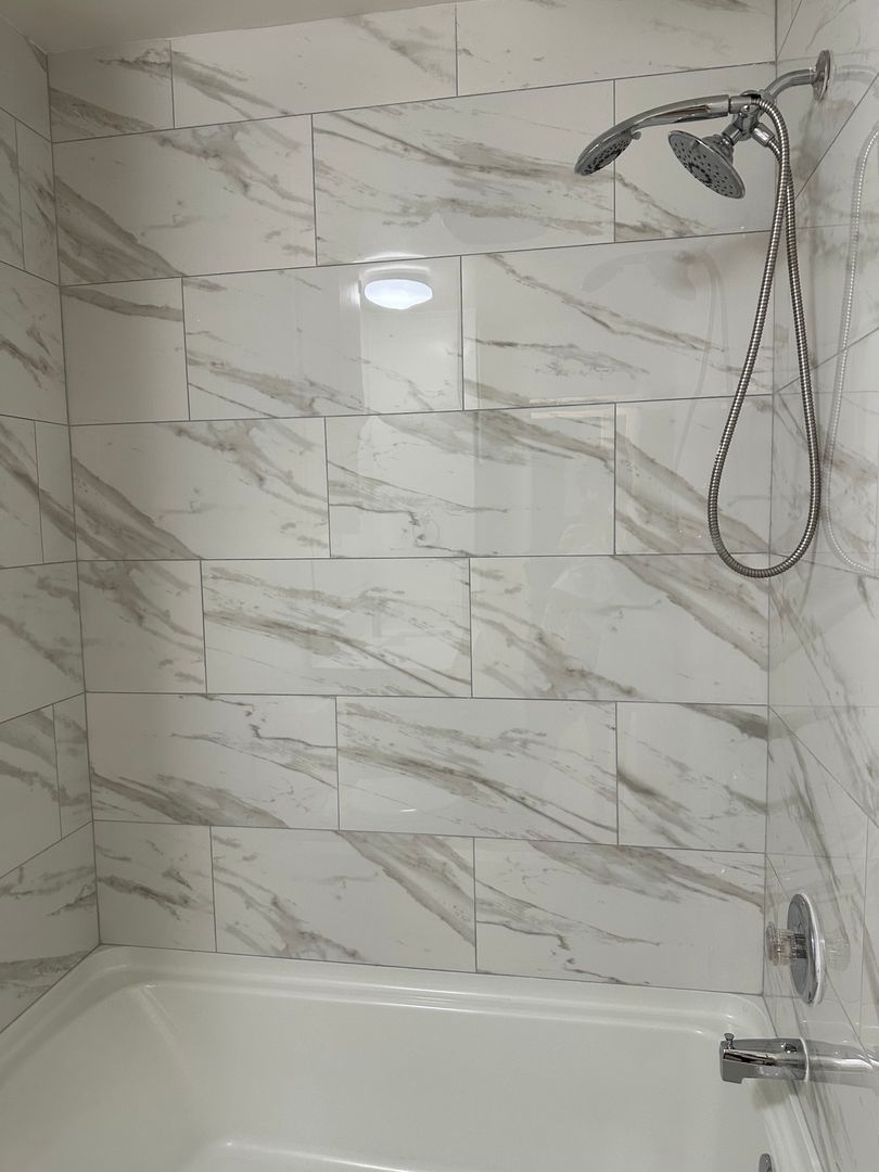 • Fully Remodeled Bathroom with Custom Tile Tub, New Vanity, and Quartz Countertop