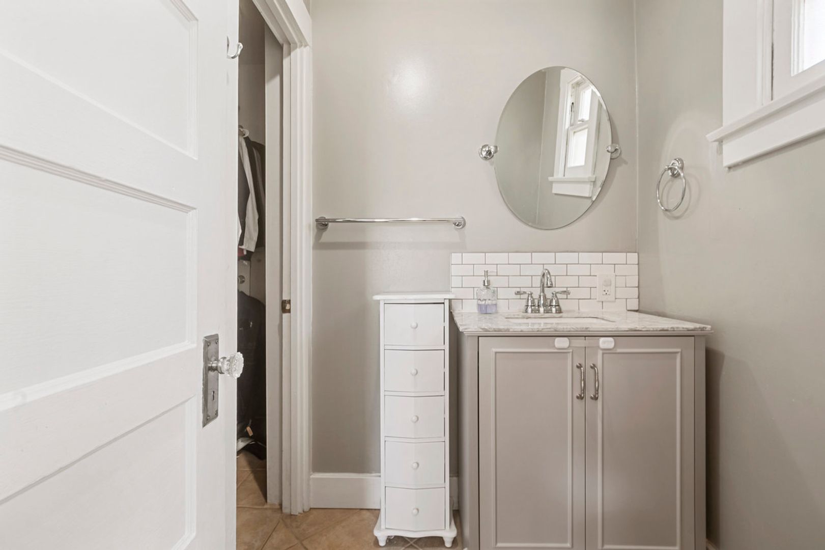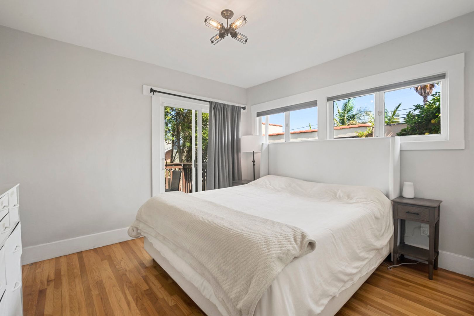 The primary bedroom has its own bathroom, with granite countertops, white subway tile backsplash, and shower details. From the primary bedroom, access the second patio deck, which overlooks the back courtyard.